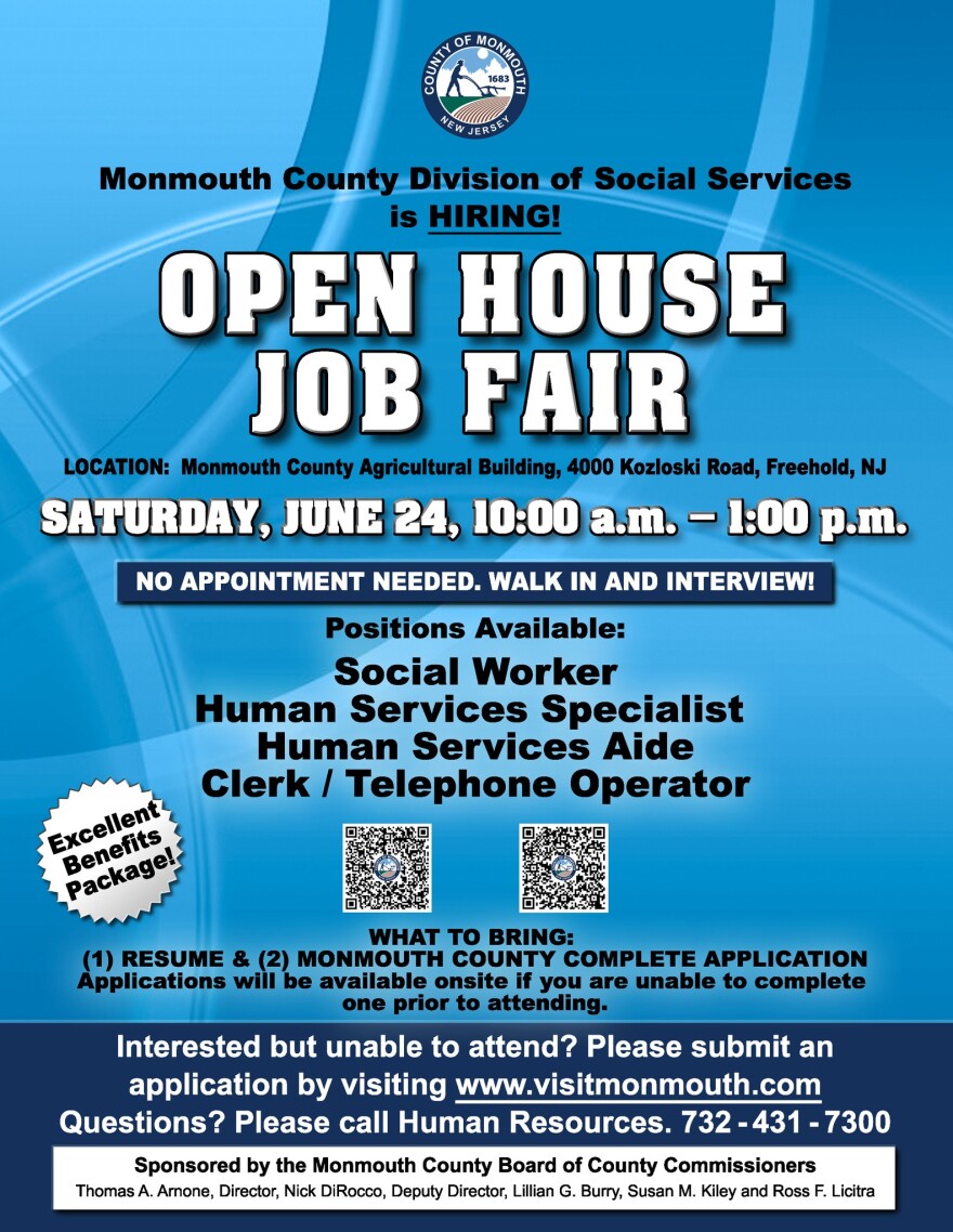 They will be holding a job fair at the Monmouth County Agriculture Building on Kozloski Road in Freehold tomorrow from 10 to 1pm. Position available include Social Worker, Human Services Specialist, Human Services Aide as well as Clerk/Telephone Operator.