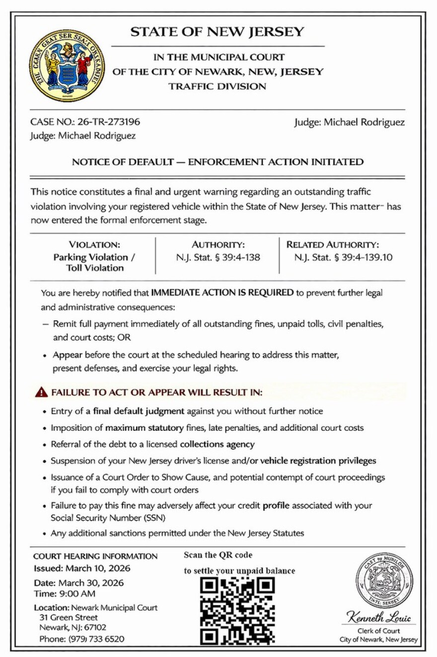 Messages referencing case 26-TR-273196 claim to be from Newark Municipal Court, but authorities say they are fraudulent and designed to steal personal information. The texts often include links and urge immediate action. The City of Newark emphasizes it does not send court notifications by text. Legitimate traffic tickets are issued on vehicles, with follow-up notices sent by mail. Residents are urged not to click on any links in suspicious messages. Instead, they should verify any violations through the state’s official NJMCDirect website. Anyone who receives one of these texts should block the sender and report it as spam.